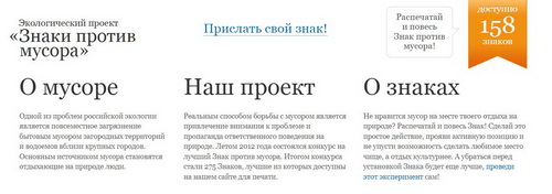 Реальным способом борьбы с мусором является привлечение внимания к проблеме и пропаганда ответственного поведения на природе. Летом 2012 года состоялся конкурс на лучший Знак против мусора. Итогом конкурса стали 275 Знаков, лучшие из которых доступны на сайте для печати.
