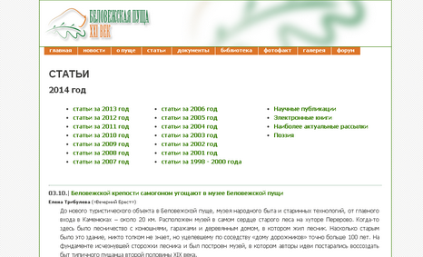 Сайт посвящен Беловежской пуще — единственному крупному остатку первичных реликтовых равнинных лесов на Европейском континенте — и проблемам ее сохранения. На сайте представлены полнотекстовые электронные книги, статьи и документы, аналитика и дискуссии. Размещена информация о заповедниках, национальных парках и других особо охраняемых природных территориях Беларуси, об актуальных проблемах охраны дикой природы, сохранения биоразнообразия, экологического образования и туризма