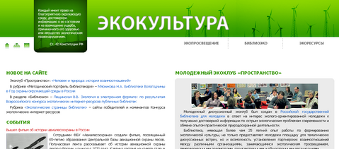 Сайт Всероссийского библиотечного научно-методического центра экологической культуры, созданного на базе Российской государственной юношеской библиотеки. Информация об экологических образовательных программах и проектах. Публикации по экологической тематике. Экологические ресурсы в библиотеках России.