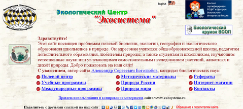 Сайт посвящен проблемам полевой биологии, экологии, географии и экологического образования школьников в природе. Он адресован учителям общеобразовательной школы, педагогам дополнительного образования, любителям природы, а также студентам и школьникам, изучающим естественные науки или увлекающимся самостоятельным исследованием растений, животных и дикой природы. Экологический центр "Экосистема" реализует несколько проектов экологического образования детей и изучения природы России и мира.